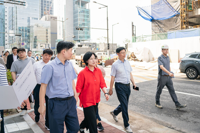 | ▲ 5일 고덕비즈밸리 현장을 방문한 이수희 구청장이 관계자들과 현장을 둘러보며 이야기를 나누고 있다. (사진=강동구청 제공) |