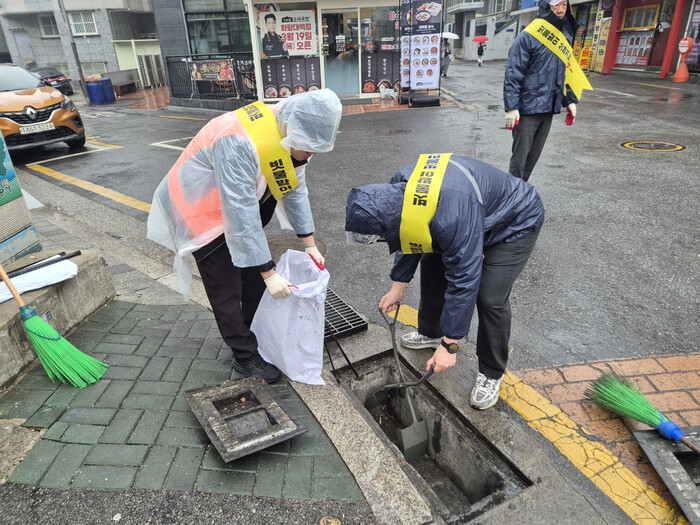 | ▲ 직원들이 빗물받이에 쌓인 이물질 제거 작업을 하고 있다. (사진=노원구청 제공) |