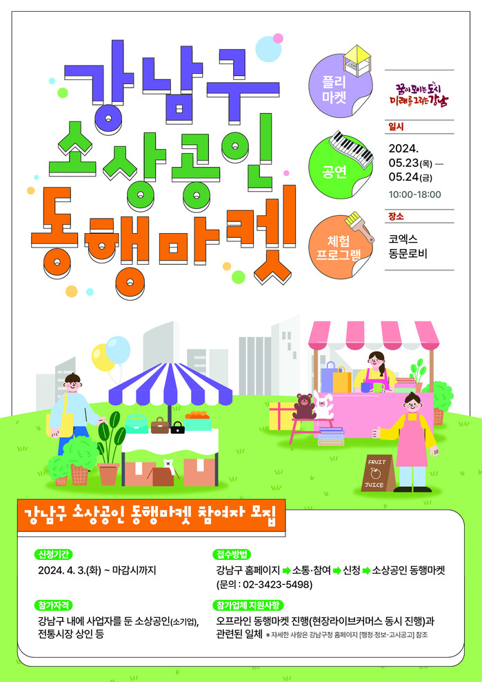 이밖에 참관객들을 발길을 사로잡기 위해 버스킹공연, 구매자 현장 이벤트, 체험 프로그램 등이 열린다. 커스텀 인형 만들기, 컬러링 엽서 등 체험 프로그램은 현장에서 ‘강남구청 카카오톡 채널’ 추가하고 SNS 이벤트에 참여하면 누구나 이용할 수 있다.