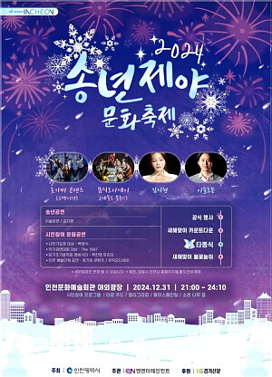 김충진 인천시 문화체육관광국장은 “인천문화예술회관 야외광장에서 시민과 함께하는 2024 송년제야 문화축제를 개최하게 돼 의미 깊다”며 “올 한 해를 따뜻하게 마무리하고 희망찬 새해를 맞이하는 뜻깊은 행사에 많은 시민들이 참여해 다양한 문화행사와 제야의 종소리, 불꽃놀이를 함께하며 사랑하는 가족, 연인, 친구와 멋진 추억을 만드시길 바란다”고 전했다.