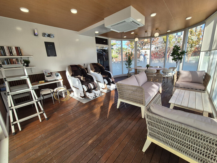 쉼터 1층에는 ▲안마의자 ▲자동혈압측정기 ▲미세먼지측정기 ▲자동심장제세동기 ▲냉?난방기를 포함해 여러 명이 함께 앉을 수 있는 테이블과 소파를 갖추고 있다.