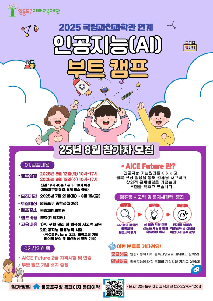 영등포구 미래교육재단 관계자는 “인공지능과 코딩 분야에 관심 있는 학생들이 실습 중심의 체험을 통해 디지털 역량을 키우는 좋은 기회가 되길 바란다”며 “국립과천과학관이 제공하는 전문 교육과정과 함께하는 만큼 학생들의 많은 관심과 참여를 기대한다”고 전했다.