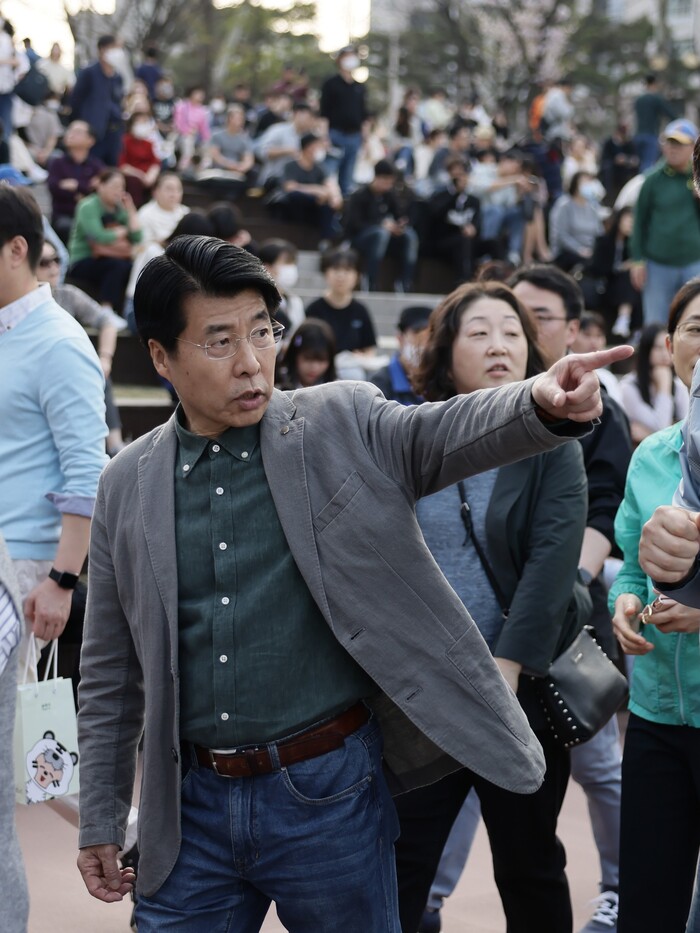 | ▲ 지난해 4월 석촌호수 인파밀집 대비 현장점검 중인 서강석 구청장. (사진=송파구청 제공) |