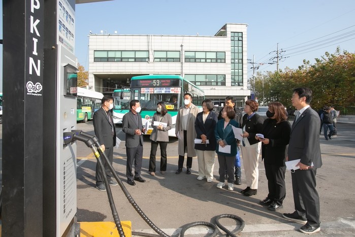 첫 방문지인 대장공영차고지에서 위원들은 소신여객, 부천버스, 성광운수, 부일교통 등 업체가 입주해 있는 대형차량면(총 227면)과 부대시설로 운영 중인 전기충전 시설(60기) 및 충전소, 세차동, 정비동 등의 시설물을 점검했다.