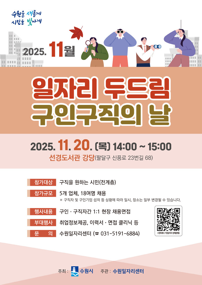 [수원=임종인 기자] 경기 수원시는 20일 오후 2시부터 3시까지 선경도서관 강당에서 ‘11월 일자리 두드림 구인ㆍ구직의 날’을 연다.