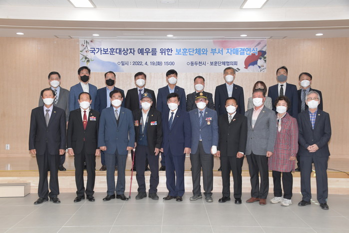 경기 동두천시가 19일 동두천시 국가보훈대상자 예우를 위한 보훈단체와 시청 부서 자매결연식을 개최했다. 동두천시 국가보훈대상자 명예 선양과 복지증진에 상호 협력하기로 약속하며 자매결연증서에 서명·교환했다. 사진은 자매결연식에서 최용덕 시장(앞줄 왼쪽 다섯 번째)과 관계자들이 기념촬영을 하는 모습. (사진제공=동두천시청)
