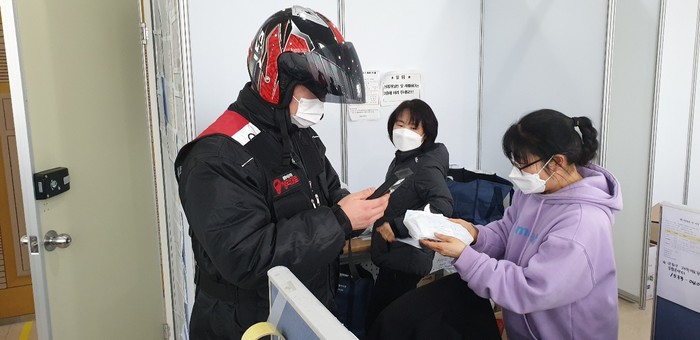 서울 양천구는 이달부터 배달 대행업체와 계약을 맺고 퀵서비스로 진료 처방약을 당일 배송하는 ‘재택치료자 처방약 퀵 배송 서비스’를 운영하고 있다. 지원대상은 1인가구나 가족이 모두 확진돼 처방약 대리 수령이 불가능한 재택치료자다. 사진은 최근 재택치료추진단에서 라벨작업 된 처방약을 수령하고 있는 기사의 모습. (사진제공=양천구청)