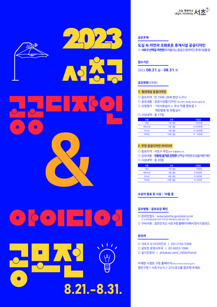 [시민일보 = 이대우 기자] 서초구(구청장 전성수)가 일상 속 편리함과 즐거움을 주는 도시환경을 만들기 위해 ‘서초구 공공디자인&아이디어 공모전’을 열고, 오는 8월21~31일 접수를 받는다.