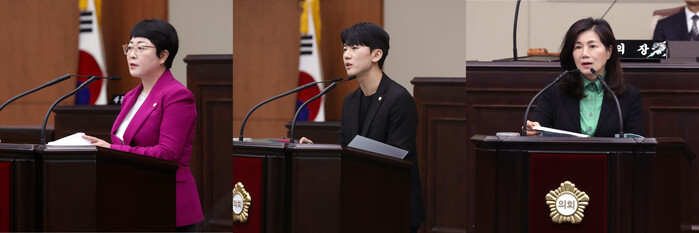 | ▲ 제337회 정례회 제3차 본회의에서 (왼쪽부터)이은경, 박재형, 안종숙 의원이 5분 자유발언을 하고 있다. (사진=서초구의회 제공) |