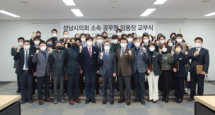 [성남=오왕석 기자] 성남시의회(의장 윤창근)는 13일 의회 4층 세미나실에서 지방의회 인사권 독립에 따라 의회사무국 전입 직원 32명에 대한 임용장을 교부하였다.