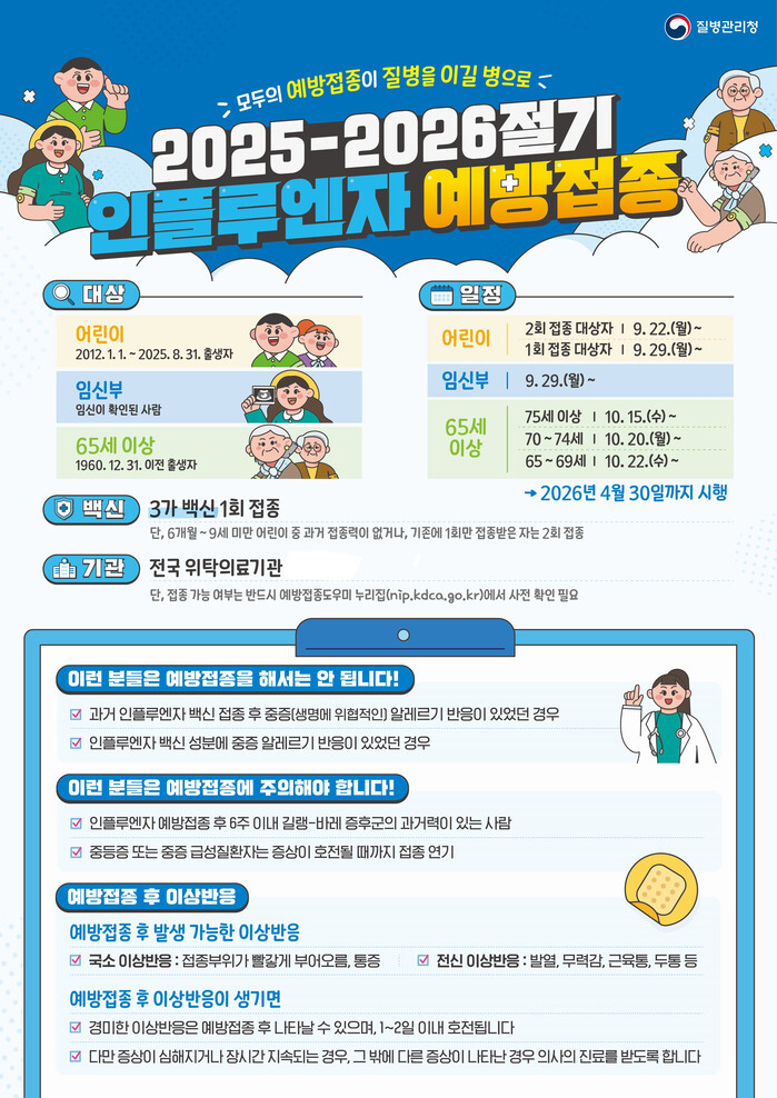 평택시 송탄보건소 관계자는 “인플루엔자 백신은 인플루엔자 바이러스로 인한 입원, 중증화 사망 위험을 크게 낮출 수 있다”며 “아직 예방접종을 받지 않으신 65세 이상 어르신과 어린이, 임신부 등 고위험군 분들은 서둘러 접종받으시길 당부드린다”고 강조했다.