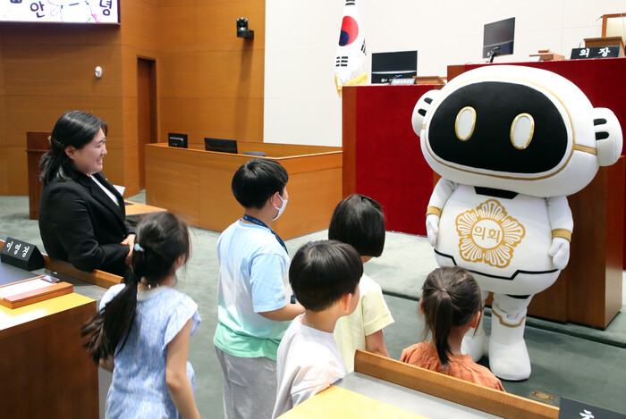 이어서 방문한 본회의장에서는 본회의가 진행되는 의원석에 앉아 본회의장의 각종 시설물과 회의 진행 과정을 실제 회의가 진행되는 영상을 시청하며 이해하였고 직접 의사봉을 두드려 볼 수 있는 체험을 하였다. 이후 성남시의회 SNS 캐릭터 ‘이로운’과 함께 기념사진을 촬영하며 견학을 마쳤다.
