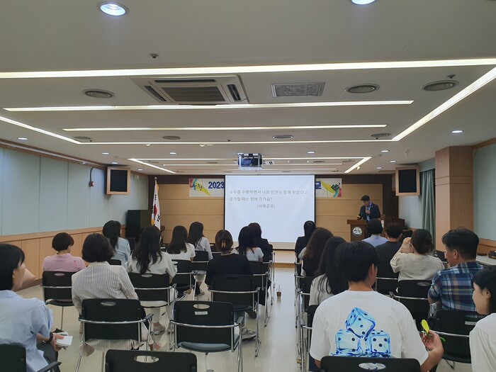 교육은 국가인권위원회 인권 전문 강사로 위촉된 최명국 강사가‘인권의 이해와 행정속의 인권’을 주제로 일상생활 속 인권문제와 개선안 및 올바른 대응방법에 대해 소개하고 다양한 의견을 공유했다.