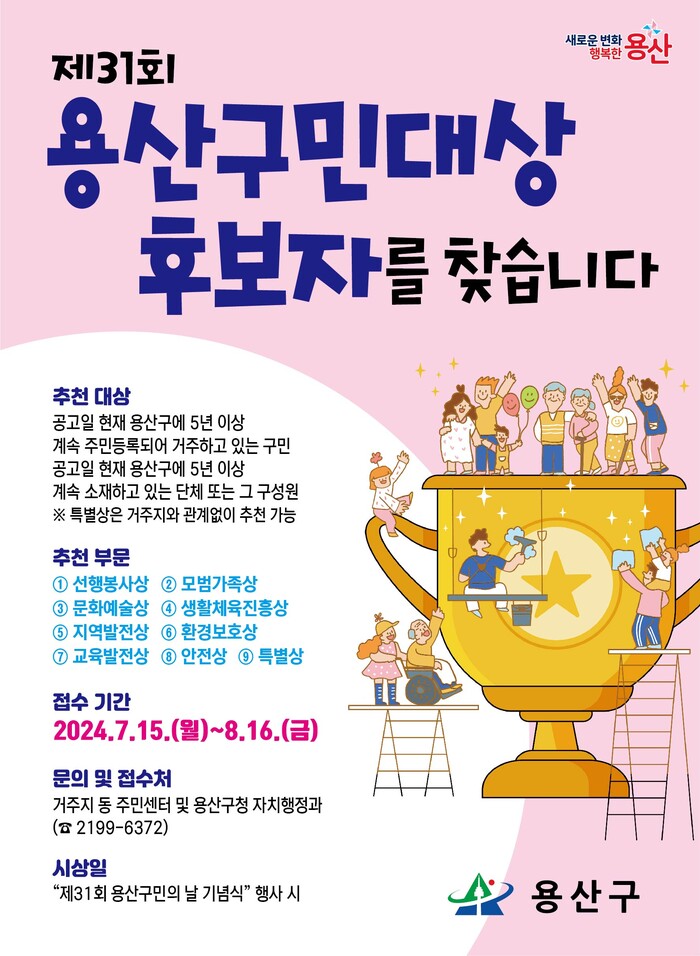 [시민일보 = 여영준 기자] 용산구(구청장 박희영)는 오는 8월16일까지 ‘제31회 용산구민대상’ 후보자를 접수한다고 밝혔다.