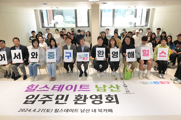 김길성 중구청장이 지난 27일 필동 ‘힐스테이트 남산’ 입주민을 위한 ‘어서와 필동, 환영해 힐스’ 행사에 참석해 주민들과 소통했다. 아파트 입주민 100여명이 참석한 가운데 구청장과의 대화, 음악회, 남산 일대 개발계획 강의, 경품 추첨 등 다채로운 행사가 아파트 내 북카페와 야외공간에서 펼쳐졌다. 사진은 김 구청장(가운데)이 주민들과 기념촬영을 하고 있는 모습. (사진=중구청 제공)