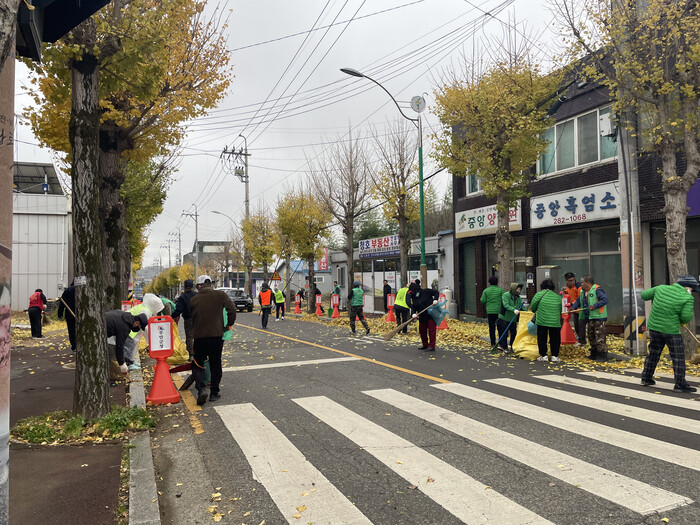 | ▲ 은행나무 낙엽 제거 봉사활동을 진행한 일로읍(출처=무안군) |