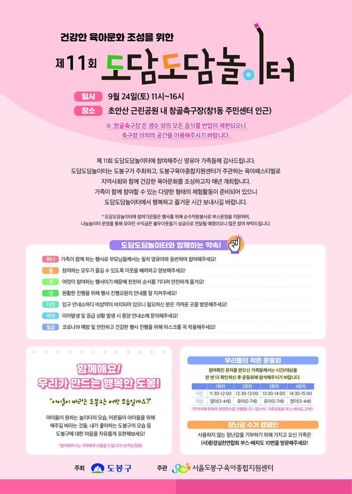 [시민일보 = 박준우 기자] 서울 도봉구(구청장 오언석)는 오는 24일 오전 11시부터 오후 4시까지 창골축구장에서 '도담도담 놀이터'를 개최한다.