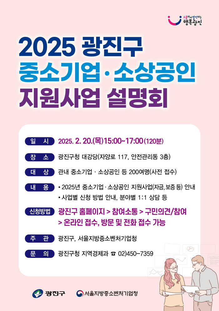 [시민일보 = 여영준 기자] 광진구(구청장 김경호)가 오는 20일 구청 대강당에서 ‘2025년 중소기업·소상공인 지원사업 설명회’를 개최한다.