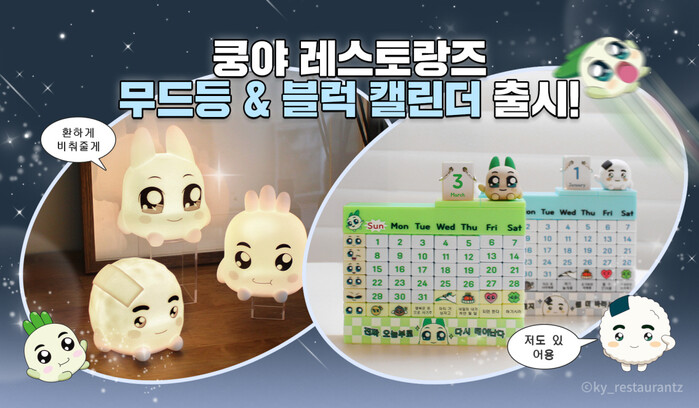 무드등은 기본 모드부터 7가지 색깔로 변경할 수 있는 컬러모드로 다양한 연출이 가능하며, 블럭 캘린더는 쿵야 레스토랑즈의 캐릭터성을 느낄 수 있는 재치있는 아이콘과 문구 블럭을 활용해 원하는 달력으로 직접 커스터마이징 가능한 상품이다.