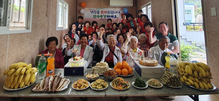 자원봉사회 회원들이 직접 만든 음식과 케이크로 생신상을 차려드리고 축하노래도 함께 부르면서 어르신들의 만수무강을 기원했다.