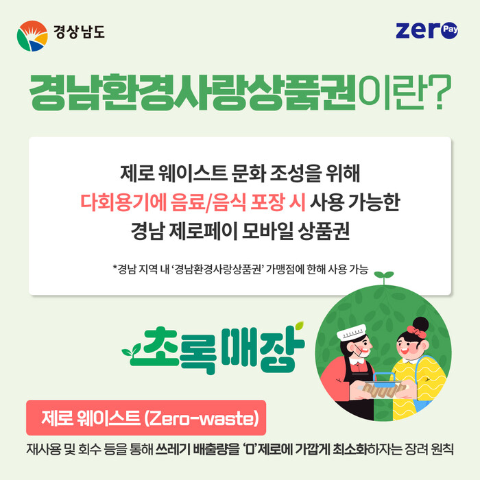 또한 도민들이 편리하게 환경사랑상품권을 사용할 수 있도록 1000여개 초록매장을 지정ㆍ운영하고 있으며, 도 홈페이지, 지맵(Z-MAP)에서 주변 초록매장을 쉽게 찾을 수 있다.