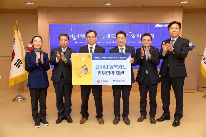광주광역시(시장 강기정)는 12일 시청 비즈니스룸에서 ㈜광주은행과 다자녀가정 우대를 위한 ‘다자녀행복카드’(기존 ‘아이사랑카드’) 혜택 확대·개편 업무협약을 체결했다.