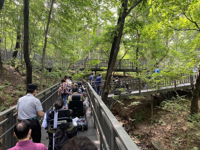 | ▲ 지역내 장애인들이 수락산 무장애숲길에서 전동보장구를 이용해 산책을 하고 있다. (사진=노원구청 제공) |