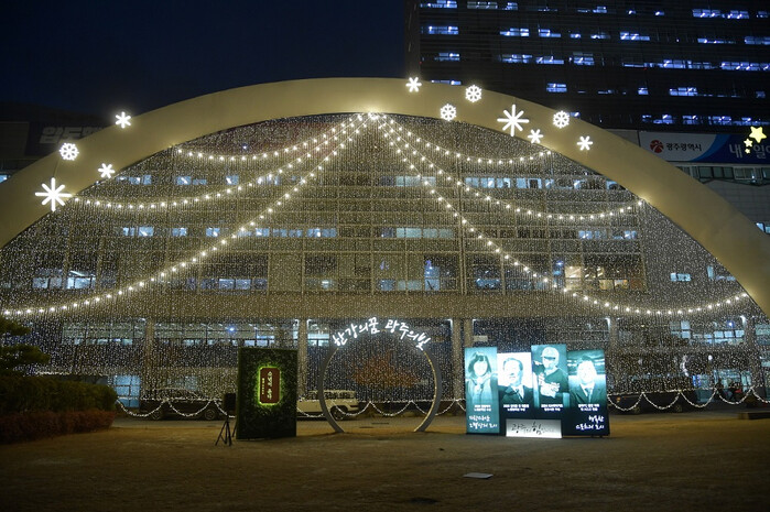 광주시는 행정동 앞 높이 12m, 길이 49m 크기의 아치형 구조물인 ‘빛고을무지개’에 발광다이오드(LED)로 조명을 설치하고, 전면부에는 광주 출신 한강 작가 노벨상 수상을 기념하는 포토존을 조성했다.