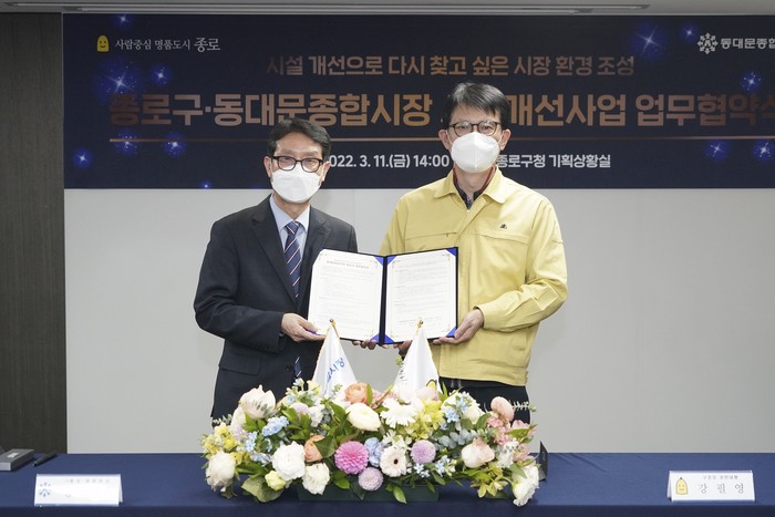 서울 종로구는 최근 동대문종합시장을 관리하는 (주)동승과 시장의 노후 전기시설을 보수·교체하는 시설개선사업 추진을 위한 업무협약을 체결했다. 구는 사업 계획의 수립과 예산 및 공사의 집행 등을, (주)동승은 상인들에게 공사안내와 민원대응 등을 맡기로 했다. 사진은 협약식에서 강필영 부구청장(오른쪽)과 양병덕 대표이사가 기념촬영을 하는 모습. (사진제공=종로구청)