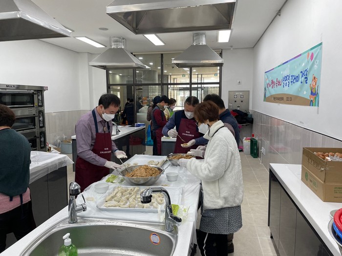 경기 양평군 옥천면 지역사회보장협의체는 최근 옥천면내 취약계층 100명에게 직접 만든 만두와 떡국떡·소고기·사골국 및 설명절 선물 등을 함께 담은 ‘다(함께)행(복한) 옥처니 설명절 꾸러미’를 전달했다. 사진은 협의체 위원들이 만두를 만들고 있는 모습. (사진제공=양평군청)