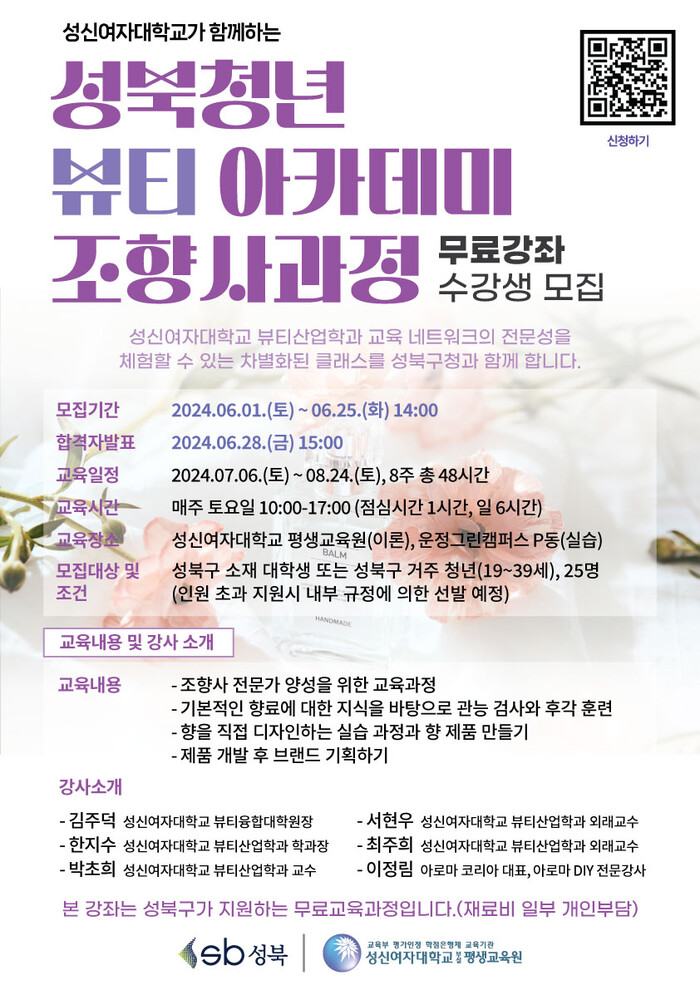 「성신여자대학교와 함께하는 성북 청년 뷰티 아카데미 조향사반」은 7월 6일부터 8주간 진행하며, 뷰티 관련 인프라를 보유한 성신여자대학교 뷰티산업학과와 협력해 운영한다.