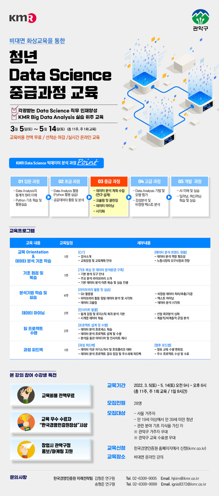 [시민일보 = 여영준 기자] 관악구(구청장 박준희)는 오는 3월5일~5월14일 데이터 사이언스 분야 청년 인재 양성을 위한 비대면 온라인 '빅데이터 분석 전문가 양성과정'을 운영한다고 15일 밝혔다.