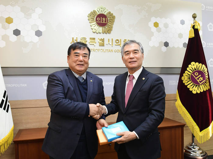 | ▲ 최근 열린 민주평화통일자문회의 호주협의회와의 간담회에서 김현기 의장(오른쪽)이 민주평통 호주협의회 고동식 회장과 악수를 하며 기념촬영을 하고 있다. (사진제공=서울시의회) |
