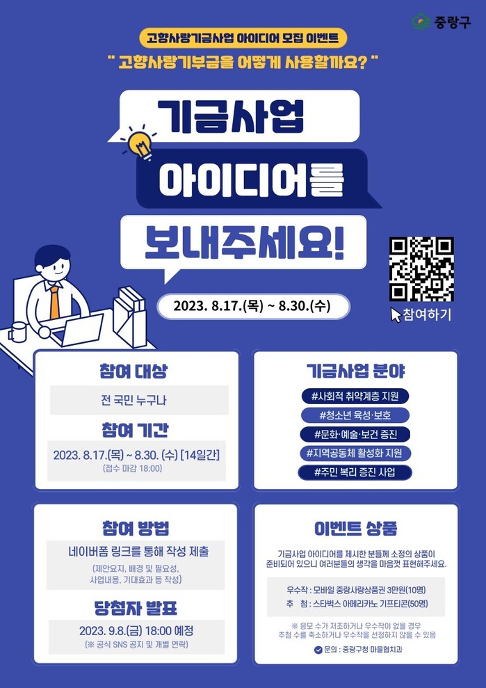| ▲ 고향사랑 기금사업 아이디어 모집 포스터 (사진=중랑구청 제공) |