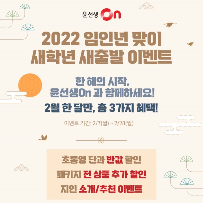 먼저, 윤선생On 신규 회원은 윤선생 초통영 단과 상품을 반값으로 만날 수 있다. 윤선생 초통영 파닉스, 말하기 1개월 상품 중 한 가지를 선택하면 정상가에서 50% 할인된 가격에 구입 가능하다. 이 이벤트는 구매 이력이 없는 신규 가입 고객에 한해 1회 참여할 수 있다.
