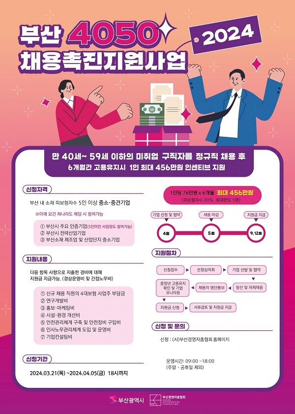 2024 부산 4050 채용 촉진 지원사업은 부산시 소재 상시근로자 5인 이상 중소·중견기업 중 40세에서 59세까지의 중년층 구직자를 정규직 채용 후 6개월 간 고용유지 시 1인당 경상운영비 및 간접노무비 등을 지원하는 사업이다.