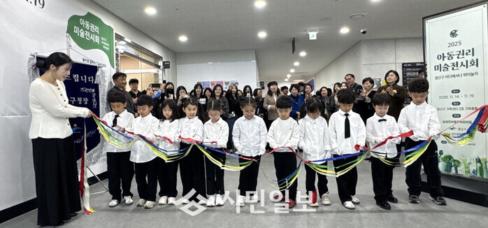 | ▲ 광산구가 14일 송정다누리복합커뮤니티센터 2층 ‘가족愛뜰’에서 아동권리 미술전시회를 개최한 가운데, 아이들이 개관 커팅식을 하고 있다. / 광주광역시 광산구청 제공 |