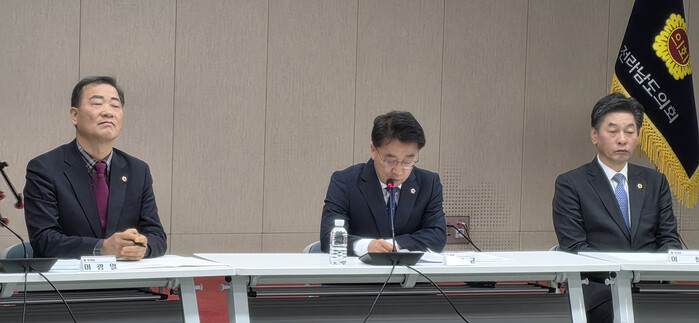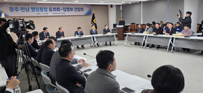 이날 간담회 자리는 시작 전 김태균 의장의 모두발언에서 "광주·전남 행정통합은 지역소멸 대응을 위한 중대한 과제지만, 도의회와 단 한 차례 협의 없이 추진된 것은 도민과 의회를 무시한 행정"이라며 강하게 입장이 표출되면서다.