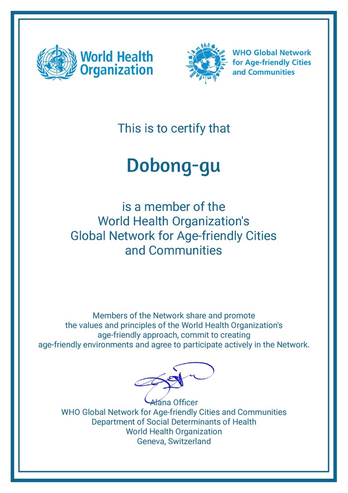 [시민일보 = 여영준 기자] 도봉구(구청장 이동진)는 최근 서울시에서 첫 번째, 전국 여섯 번째로 세계보건기구(WHO)로부터 '고령친화도시' 재인증을 받았다고 25일 밝혔다.