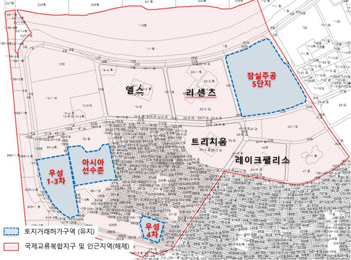 이번에 해제되는 구역은 현재 재건축이 진행 중인 잠실주공5단지, 우성 1·2·3·4차, 아시아 선수촌을 제외한 잠실동 모든 아파트 단지다.