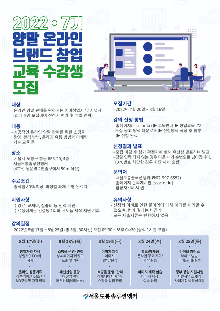 [시민일보 = 박준우 기자] 서울도봉솔루션앵커(창동 655-20, 4층)가 '2022년 제7기 양말 온라인 브랜드 창업 교육'과 '온라인 유통 마케팅-온라인 상품페이지 실무 교육' 수강생을 모집 중이다.