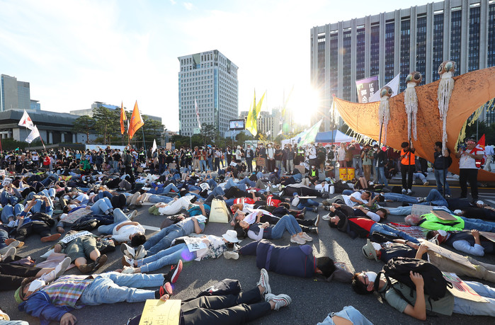 24일 그린피스와 기후위기비상행동 등 400여개 단체로 구성된 '9월기후정의행동'이 주최한 기후정의행진 참가자들이 서울 세종대로에서 기후위기를 경고하며 도로 위에 드러눕는 다이-인(Die-In) 시위를 하고 있다.