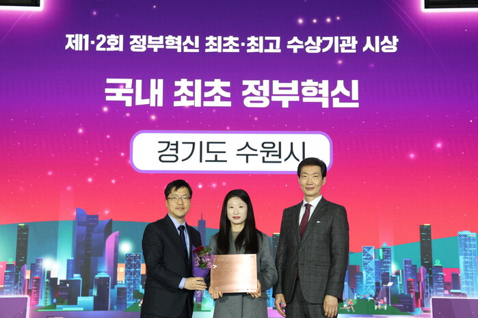 | ▲ 지난 24일 부산 벡스코에서 열린 제1·2회 정부혁신 최초·최고 수상기관 시상식에서 수원시 관계자가 수상하고 있다. (사진=수원시청 제공) |