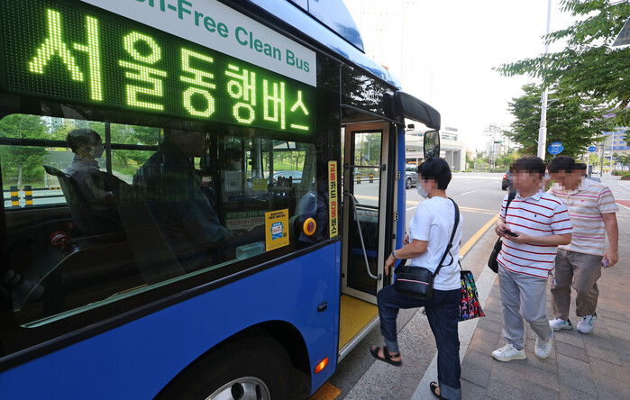수도권 주민의 서울 출근길을 돕는 서울동행버스 운행이 시작된 21일 오전 경기 김포시 풍무동의 한 정류장에서 시민들이 서울동행버스에 탑승하고 있다.