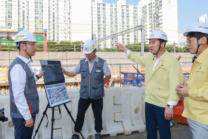 오언석 서울 도봉구청장이 최근 지역내 태풍 대비 시설물 현장 방문에 나섰다. 이날 오 구청장은 주택재개발정비사업이 진행 중인 대형공사장(도봉동 634-2) 등 6곳을 방문해 안전 조치 현황 등을 살폈다. 사진은 오 구청장(오른쪽 두 번째)이 창동역 민자역사 공사현장을 찾아 시설물 등을 점검하고 현장 책임자에게 태풍 피해 예방에 최선을 다할 것을 당부하고 있는 모습. (사진=도봉구청 제공)