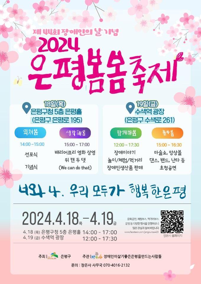 [시민일보 = 이대우 기자] 서울 은평구(구청장 김미경)는 오는 18~19일 은평구청과 수색역 광장에서 장애인과 비장애인이 함께 참여하는 소통과 화합의 장인 제44회 장애인의 날 기념 ‘은평봄봄축제’를 개최한다고 밝혔다.