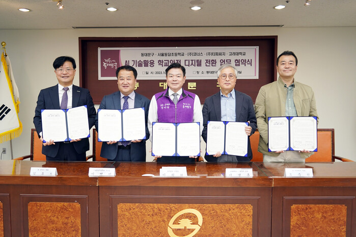[시민일보 = 이대우 기자] 서울 동대문구(구청장 이필형)는 지난 18일 서울동답초등학교, ㈜코너스, ㈜TPCG, 고려대학교와 ‘AI기술 활용 학교안전 디지털 전환’을 위한 업무협약을 체결했다.