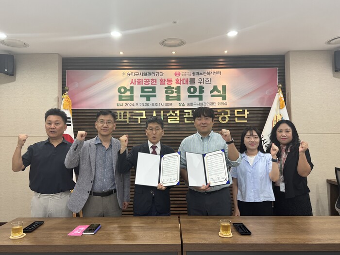 [시민일보 = 이대우 기자] 송파구시설관리공단(이사장 황대성)과 송파노인복지센터는 송파구 내 노인복지 사회공헌활동을 위한 유기적인 상호협력체계를 구축하고 이를 확대하기 위해 업무협약을 체결했다.