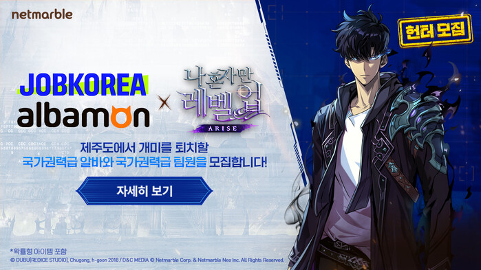 [시민일보 = 여영준 기자] 넷마블은 액션 게임 <나 혼자만 레벨업:어라이즈>가 대표 커리어 플랫폼 잡코리아, 알바몬과 협업을 통해 오는 12월 업데이트 예정인 ‘제주도 레이드’에 참가할 헌터를 공개모집 한다고 8일 밝혔다.