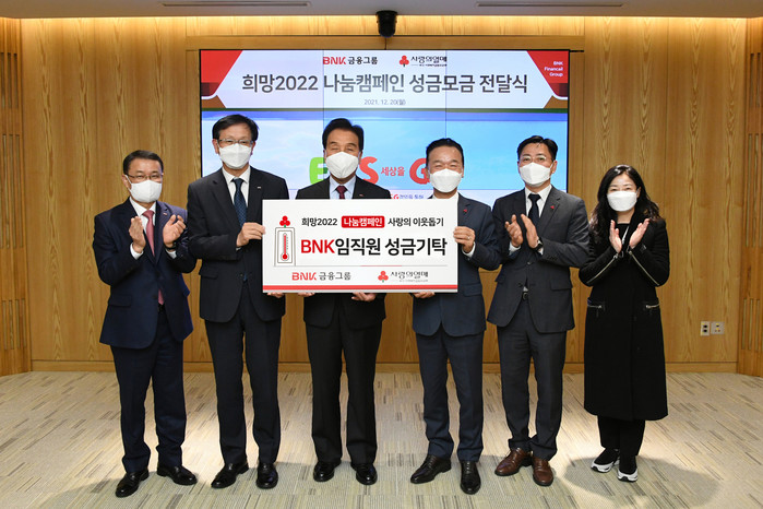 BNK 금융그룹은 지난 20일 오후, 본사에서 BNK금융지주와 부산은행, 각 계열사(경남은행 제외) 임직원들의 자발적 참여(임직원 급여공제 및 회사 기부금)로 조성한 이웃사랑 성금 1억원을 부산사회복지공동모금회에 전달했다.